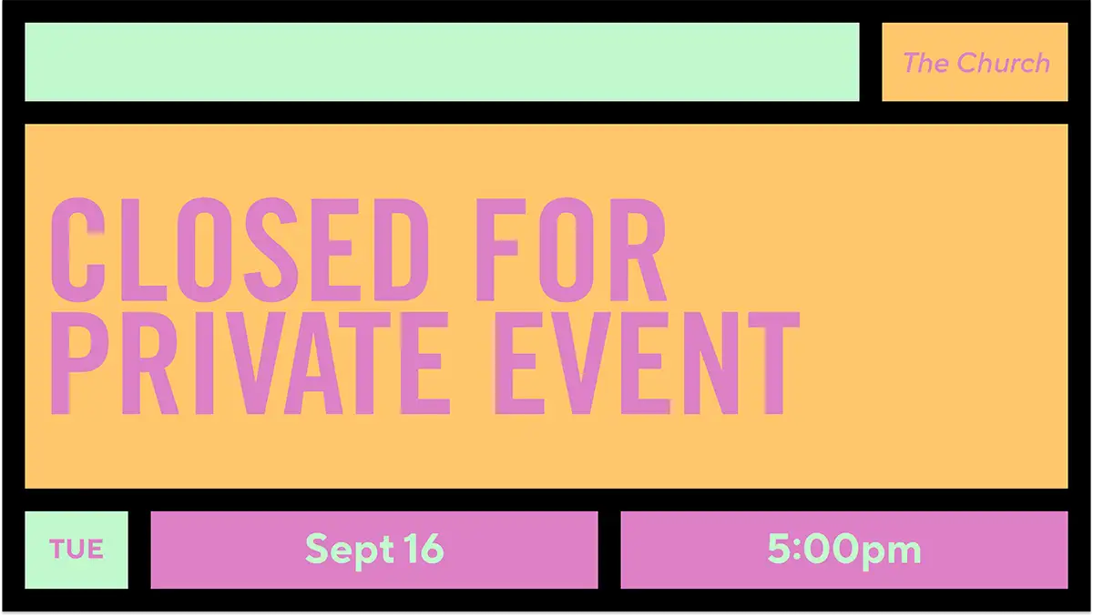 Sep 16 Closing Early September 16th Tuesday, September 16th, 2025|5:00 PM - 9:00 PM We are closing The Church at 5:00 PM today for a special event. Thank you.