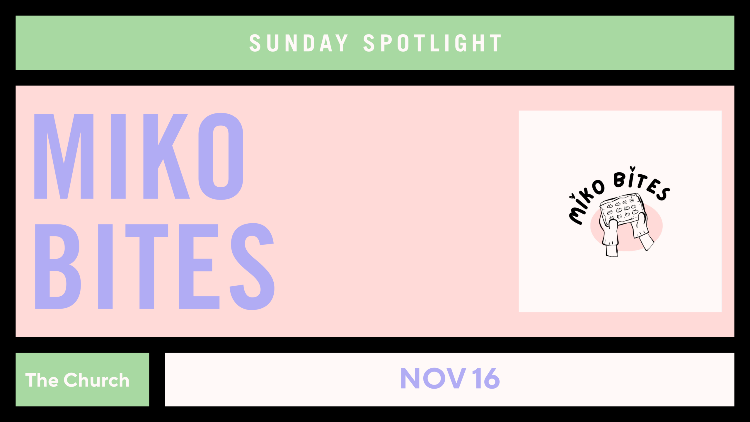 Nov 16 Miko Bites Sunday, November 16th, 2025|11:30 AM - 6:00 PM Join us every Sunday at the Church to shop with local vendors from 11:30 AM to 6:00 PM.