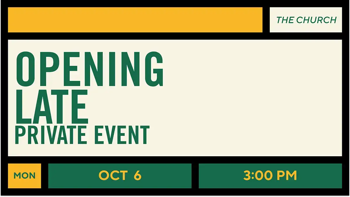 Oct 6 Opening Late – Private Event Monday, October 6th, 2025|3:00 PM - 9:00 PM We are closing The Church at 3:00 PM today for a special event. Thank you.