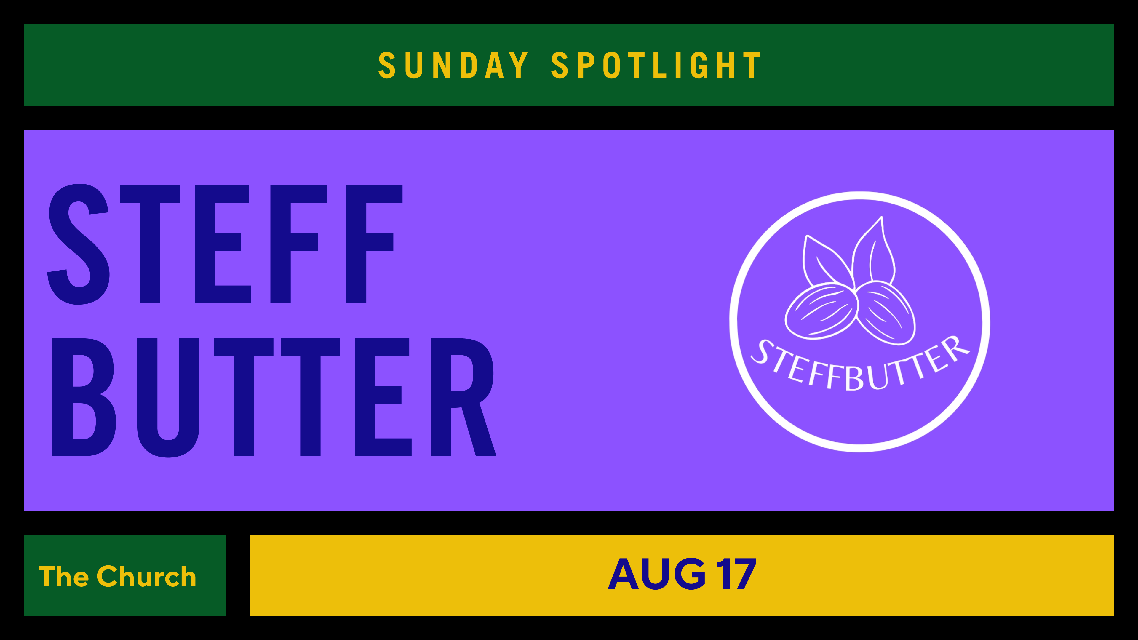 Aug 17 Steff Butter Sunday, August 17th, 2025|11:30 AM - 6:00 PM Join us every Sunday at the Church to shop with local vendors from 11:30 AM to 6:00 PM.